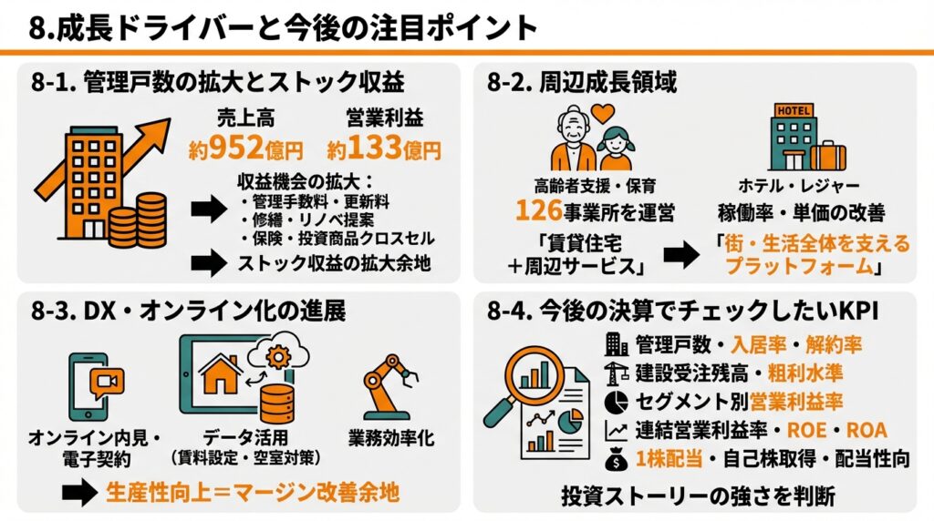こうした周辺事業はまだ利益インパクトは限定的ですが、「賃貸住宅+周辺サービス」から「街・生活全体を支えるプラットフォーム」へとビジネスの裾野を広げる役割を担っています。