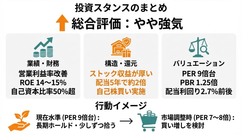 - 足元のPER 9倍台・PBR 1.25倍・配当利回り約2.7%は、ROEや事業の安定性を考慮すると、おおむね妥当〜やや割安圏と評価しうる水準。