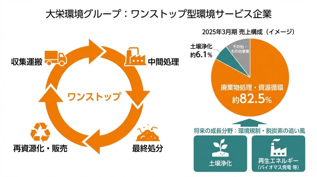 という構造です。特に民間で焼却・最終処分まで自前で持てる会社は少なく、ここが大栄環境の強みになっています。