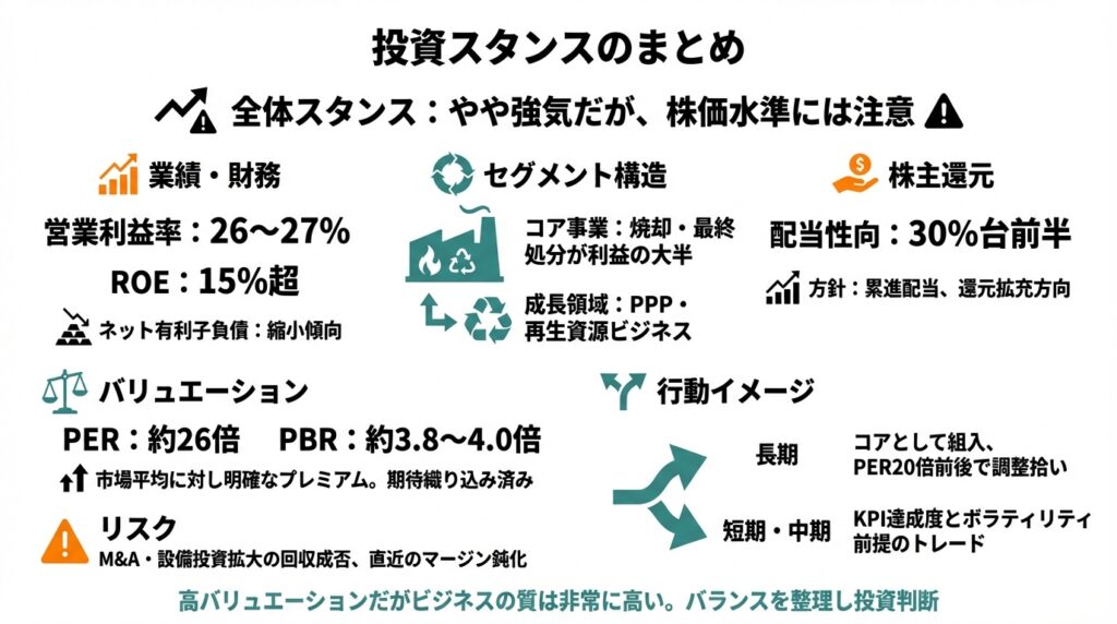 - 焼却・最終処分能力を背景にしたコア事業が利益の大半を稼ぎ、PPPや再生資源ビジネスで安定性・成長性の両方を狙う構造。