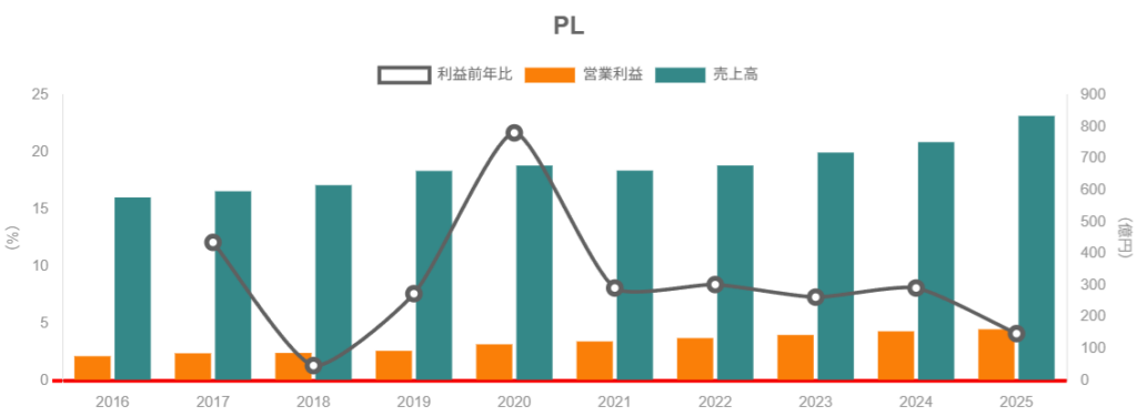 - 2019〜2025年で売上CAGR約4%、営業利益CAGR約6〜7%、営業利益率20%前後、ROE11〜12%と「中成長×超堅実財務」のプロファイル。