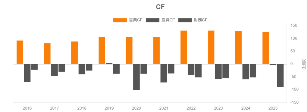 - 営業利益率20%前後、ROE11〜12%、実質無借金・自己資本比率80%超の超堅実財務。