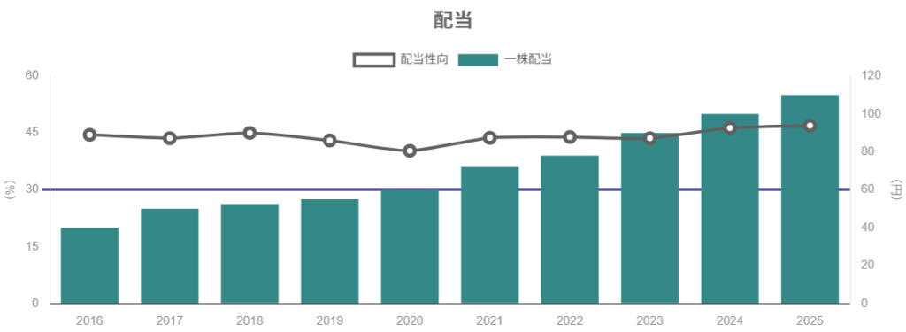 - 配当性向40%台後半、利回り約2.6%、実質的な長期増配+2025年に1.9%規模の自社株買い。
