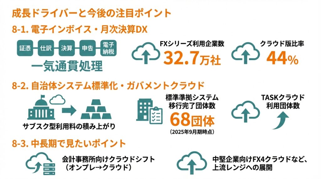 中長期投資の観点では、「クラウド比率の伸び」と「利用企業数の増加」が、この事業の成長度合いを見る重要KPIになりそうです。