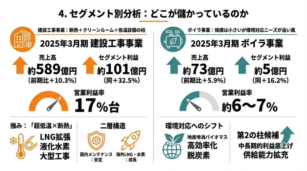 グローバルには、東南アジア・豪州などに複数拠点を持ち、LNG船や受入基地など超低温領域の断熱に強みを持つ「省エネ・環境インフラの裏方企業」と捉えるとイメージしやすいと思います。