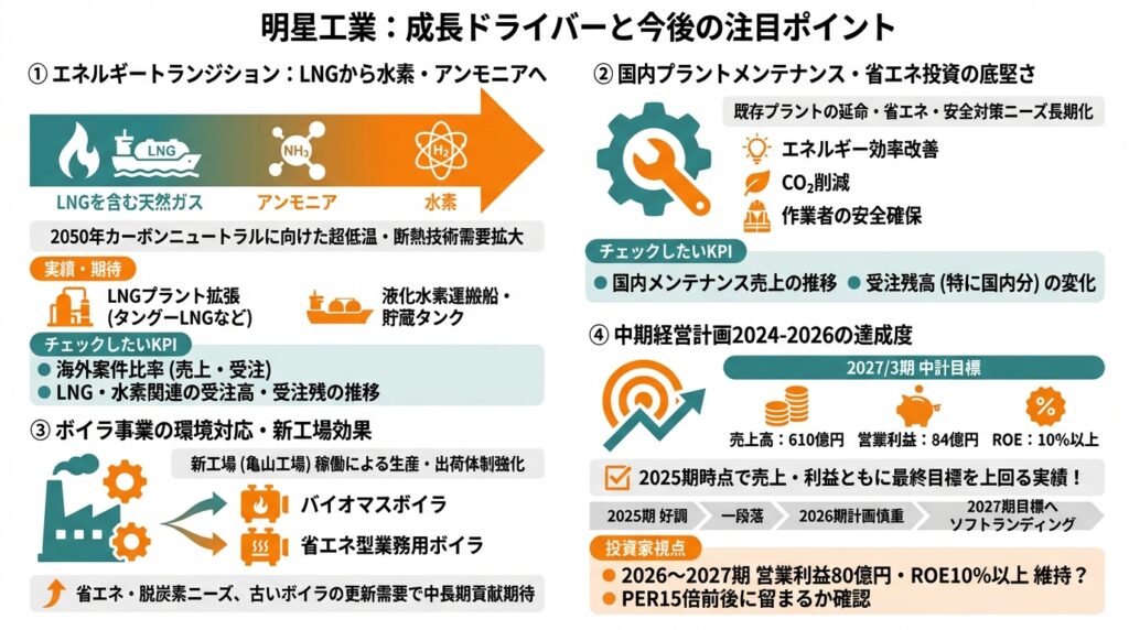 - 国内メンテナンスという安定収益源に加え、LNG・水素などの成長ドライバーを持つ
