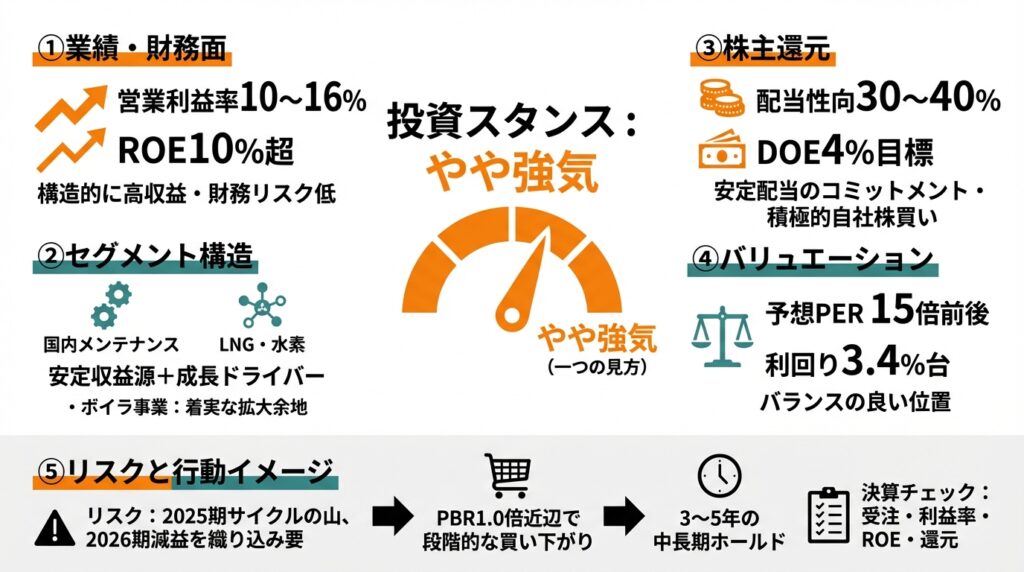 - 一方で、エネルギー・プラント投資サイクル、工事採算、技術・人材・ガバナンスなどのリスク要因も多く、2025期の好業績を前提にした過度な成長期待には注意が必要。