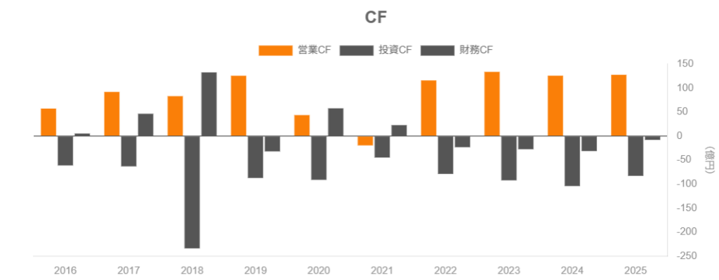 営業利益率16%台・ROE二桁台を維持。 - ネット有利子負債は自己資本の3%程度、自己資本比率50%超と、財務健全性は高い。