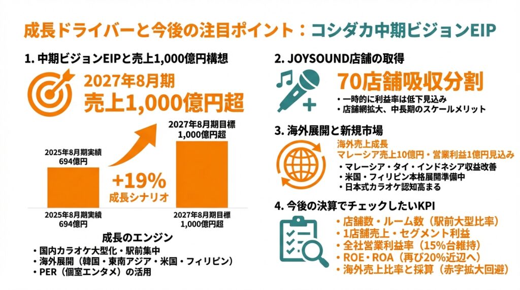 - 中期ビジョン「EIP」により、2027年8月期売上1,000億円を目指す成長ストーリーを描いている。