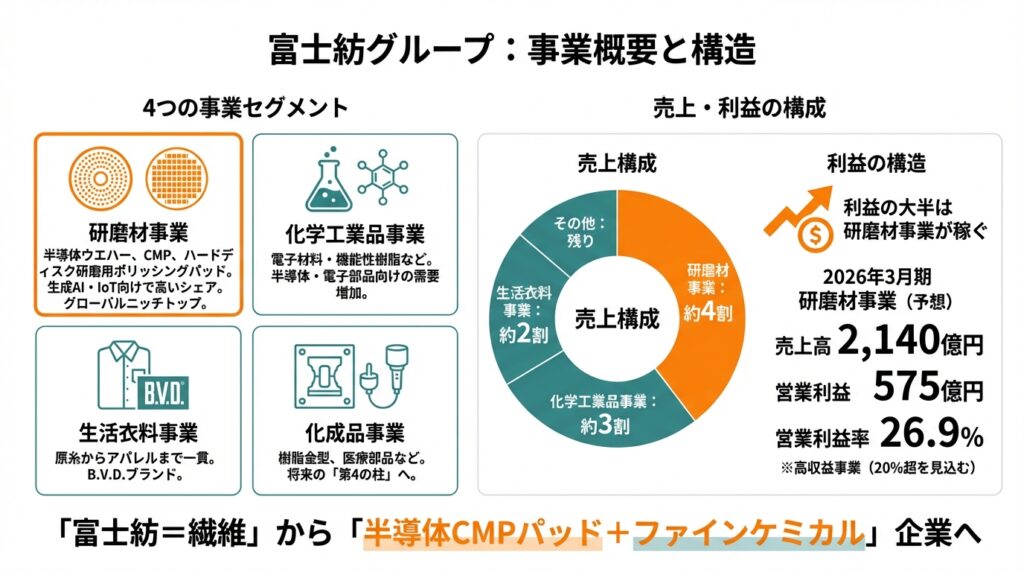 • 富士紡は、「繊維の会社」から半導体CMPパッド&ファインケミカル企業へと事業構造を転換中。利益の柱は研磨材事業。