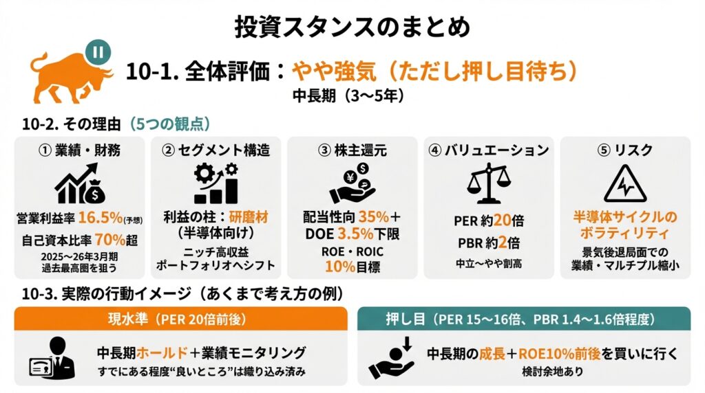 • 中長期では「やや強気」スタンスも取り得るが、半導体サイクルのボラティリティを前提に、PER15〜16倍程度までの押し目を狙う戦略も検討余地がある。