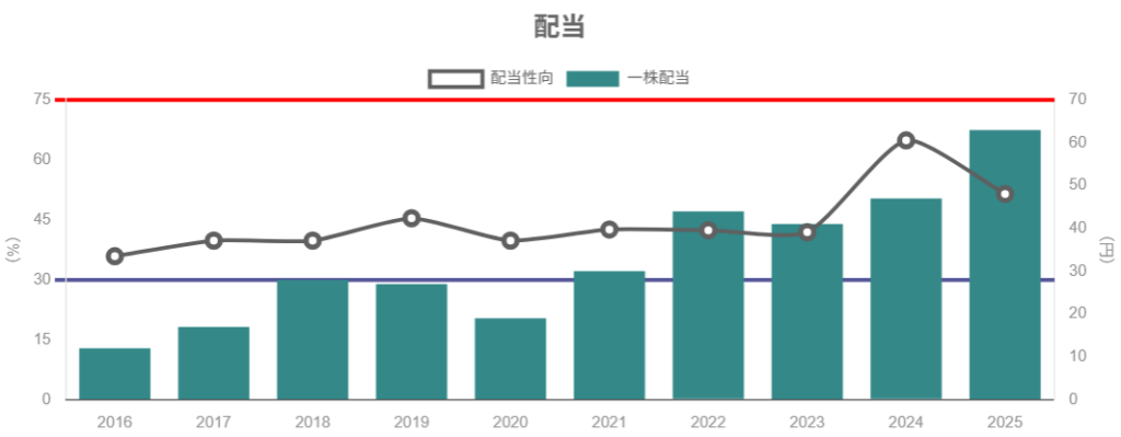 - 2022〜2025年にかけて、ROE20%前後×自己資本比率約60%×高配当という、質の高い財務・収益構造を維持している。