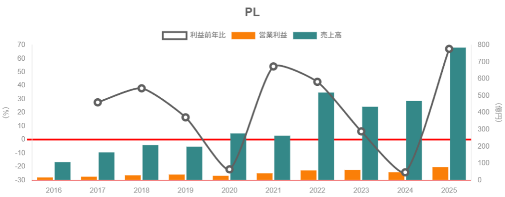 - 2022〜2023年は、売上の振れ幅は大きいものの、営業利益率は10〜14%台と高水準を維持。