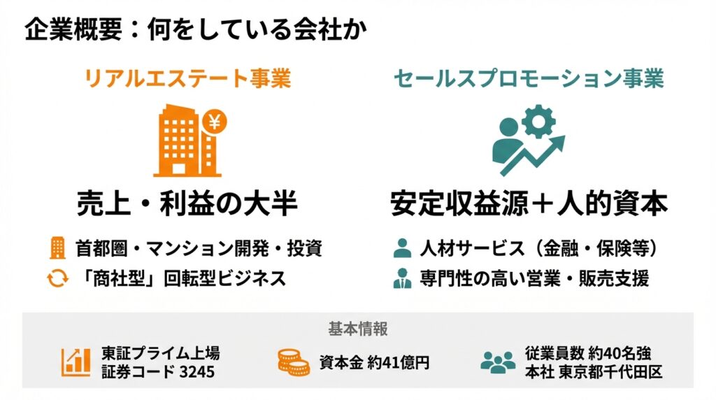 売上・利益の大半はリアルエステート事業が生み、セールスプロモーション事業は利益規模こそ小さいものの、市況に比較的左右されにくい安定収益源+人的資本プラットフォームという位置づけと捉えられます。