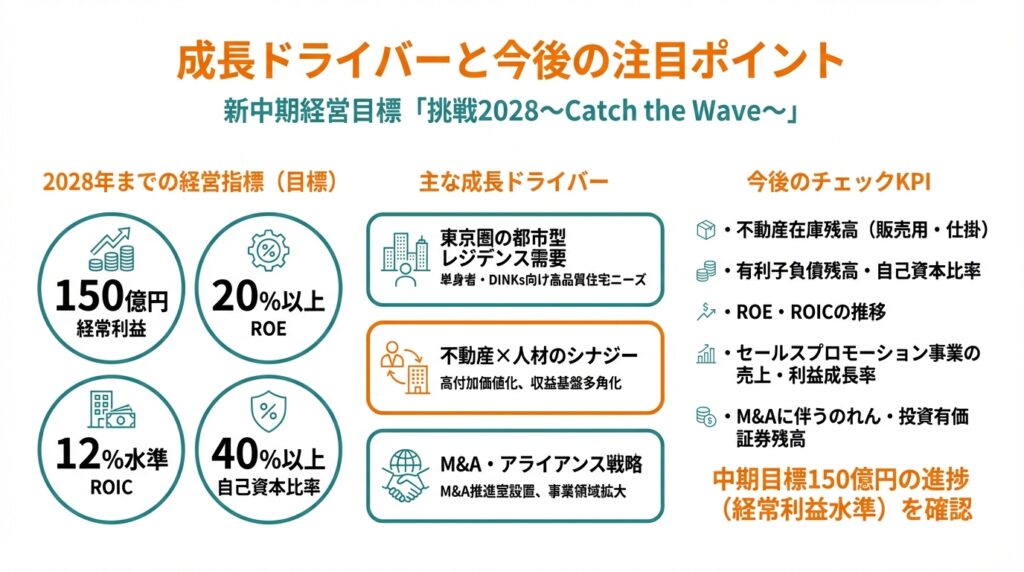 - 新中期目標「挑戦2028」では、経常利益150億円・ROE20%以上など野心的なKPIを掲げており、M&A・人材投資・DXを通じた成長シナリオが示されている。
