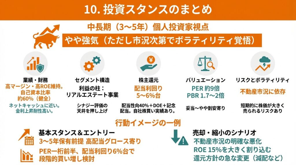 - 一方で、不動産市況・金利・在庫水準・M&Aリスクなどにより、業績・株価のボラティリティは高めであり、短期的な値動きよりも3〜5年スパンでの投資判断が求められる。