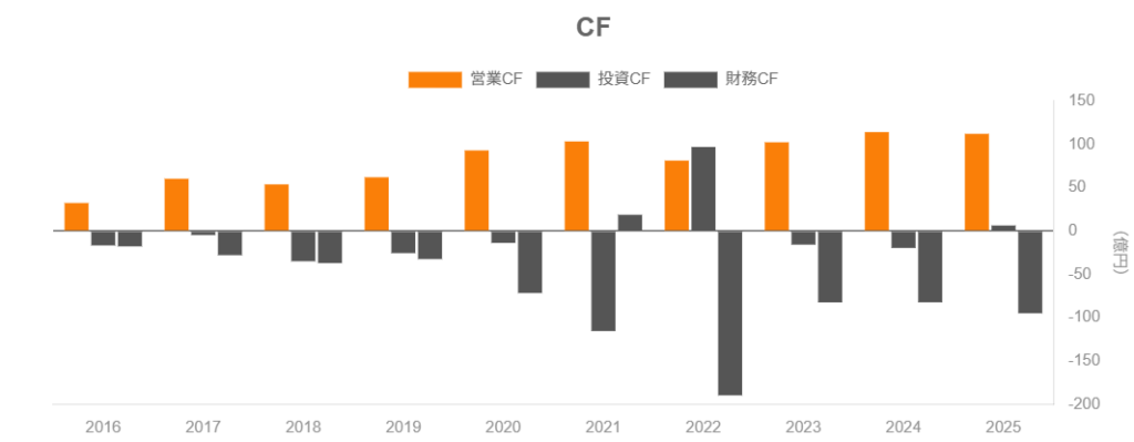 3. 営業CFマージン20%超・設備投資10〜15億円規模という構造から、フリーCFは毎期70〜120億円規模で安定しており、配当+自社株買いを支える強いキャッシュ創出力があります。