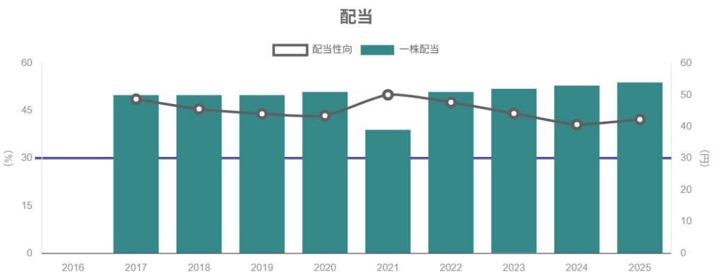 • 配当はコロナ期を除き安定増配を継続、配当性向40〜50%レンジ