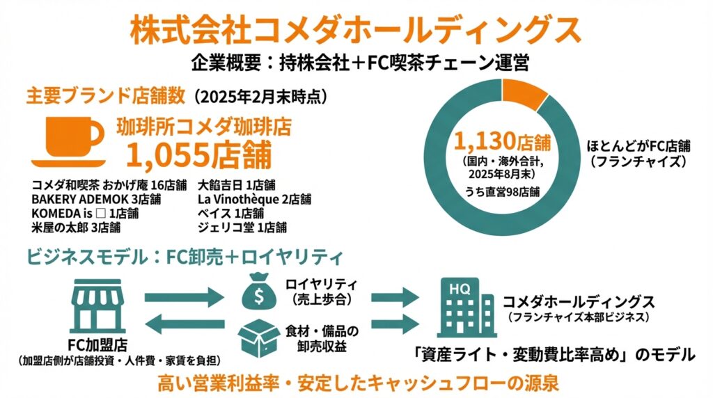 といった「フランチャイズ本部ビジネス」です。直営店は全体の一部にとどまり、店舗投資や人件費・家賃の多くは加盟店側が負担する“資産ライト・変動費比率高め”のモデルとなっています。