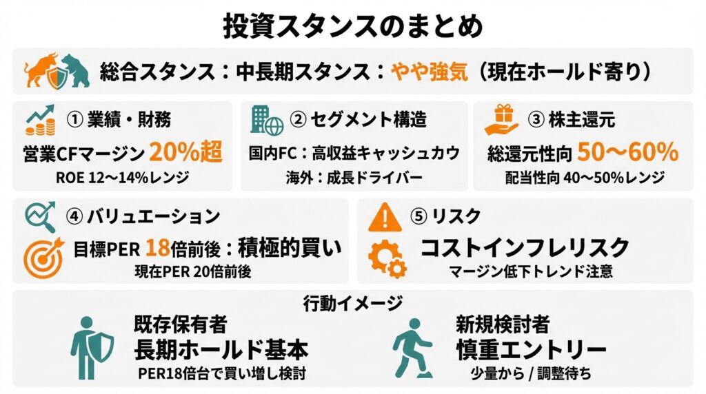 5. 投資判断上の注目ポイントは、マージンの下げ止まり、ROEの維持、海外事業の収益化スピード、そしてFC加盟店との関係性・海外PMIなどビジネスモデル特有のリスクのマネジメントです。