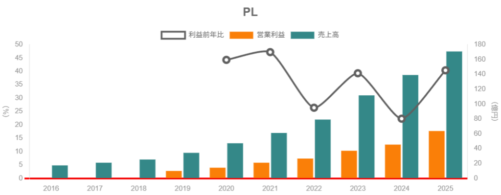 - 売上CAGR約29%、営業利益CAGR約35%と高成長が継続