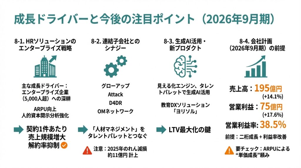 - グローアップ(キミスカ)、Attack(採用BPO)、D4DR(未来戦略コンサル)、OMネットワーク(R-Shift/R-Kintai)など、M&Aで取り込んだ周辺サービス群