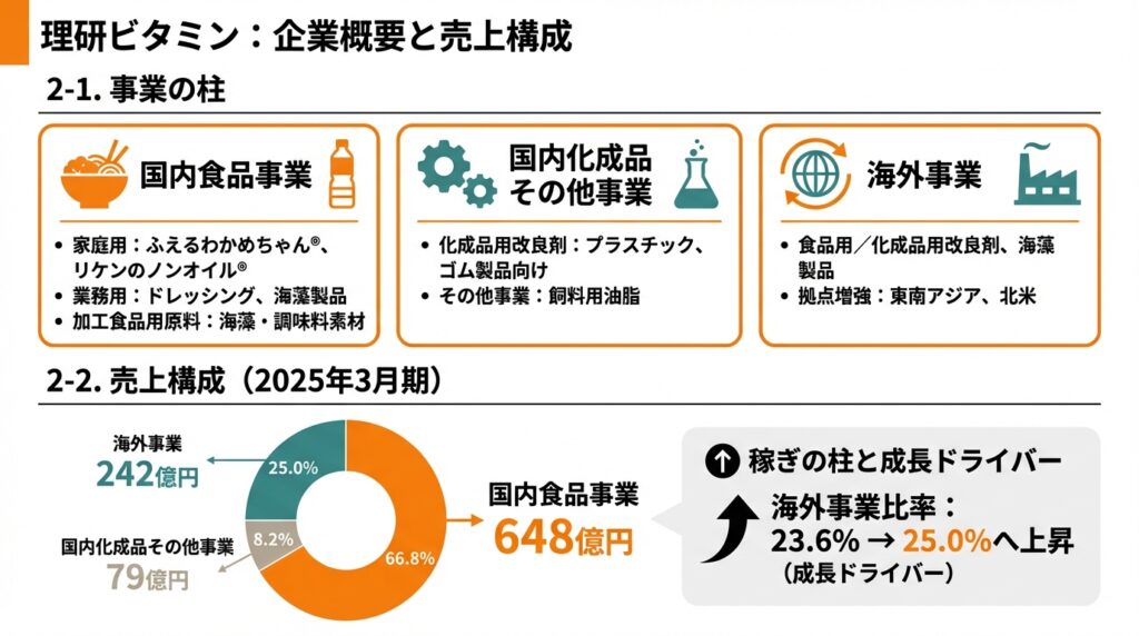 - 理研ビタミンは、家庭用ブランド+業務用食品+改良剤(食品・化成品)+海外事業を組み合わせた収益基盤の厚い食品・素材メーカー。