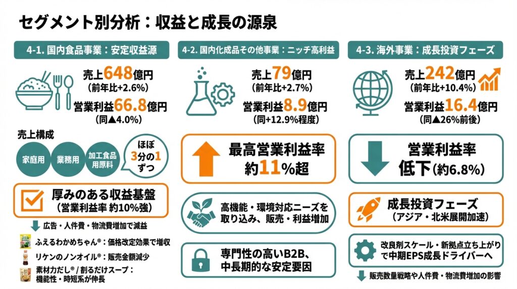 営業利益率は約10%強とセグメントの中で最も高く、家庭用ブランドと業務用・原料ビジネスを組み合わせた「厚みのある収益基盤」と評価できます。