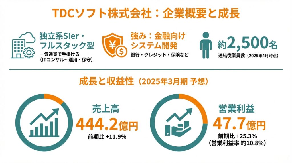 競合としては、規模の大きい TIS(3626)、SCSK(9719)、やや近いレンジの DTS(9682) などが挙げられます。これら大手は売上規模で数千億〜1兆円クラスで、TDCソフト(売上400億円台)は「中堅〜準大手」の立ち位置と考えられます。
