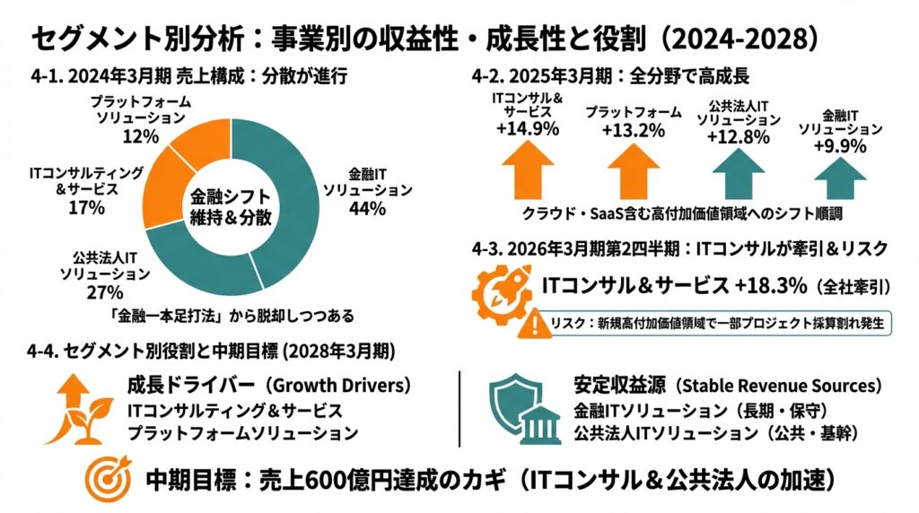 - 金融ITを柱に、公共法人・ITコンサル&サービス・プラットフォームがバランスよく伸びている。