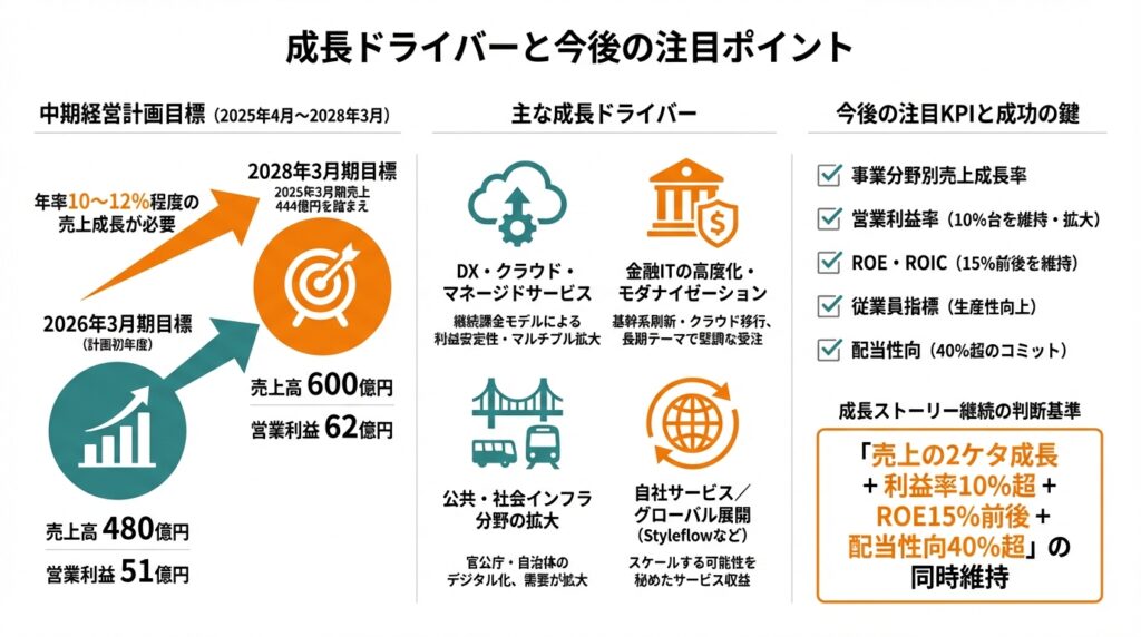 中期計画の売上600億円(2028年3月期)を達成するには、ITコンサル&サービスと公共法人の成長加速がカギになりそうです。