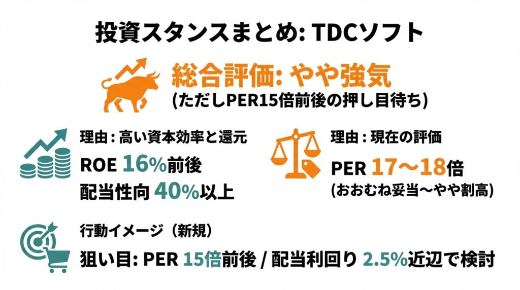 あくまで一つの考え方ですが、TDCソフトは「高配当バリュー」ではなく“そこそこ成長するクオリティ中型株”として位置づけると、投資判断が整理しやすいように思われます。