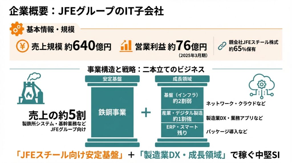 - 売上規模は2025年3月期で約640億円、営業利益約76億円と、中堅SIのポジション
