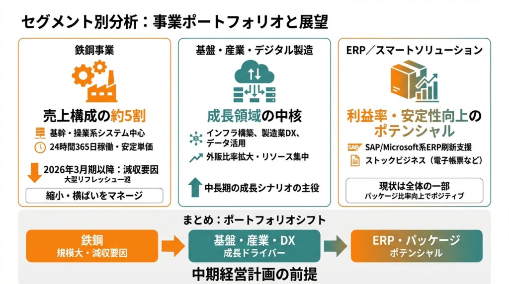 - 鉄鋼事業は縮小フェーズだが、基盤・DX・ERP・パッケージなどの成長領域が育ってきている