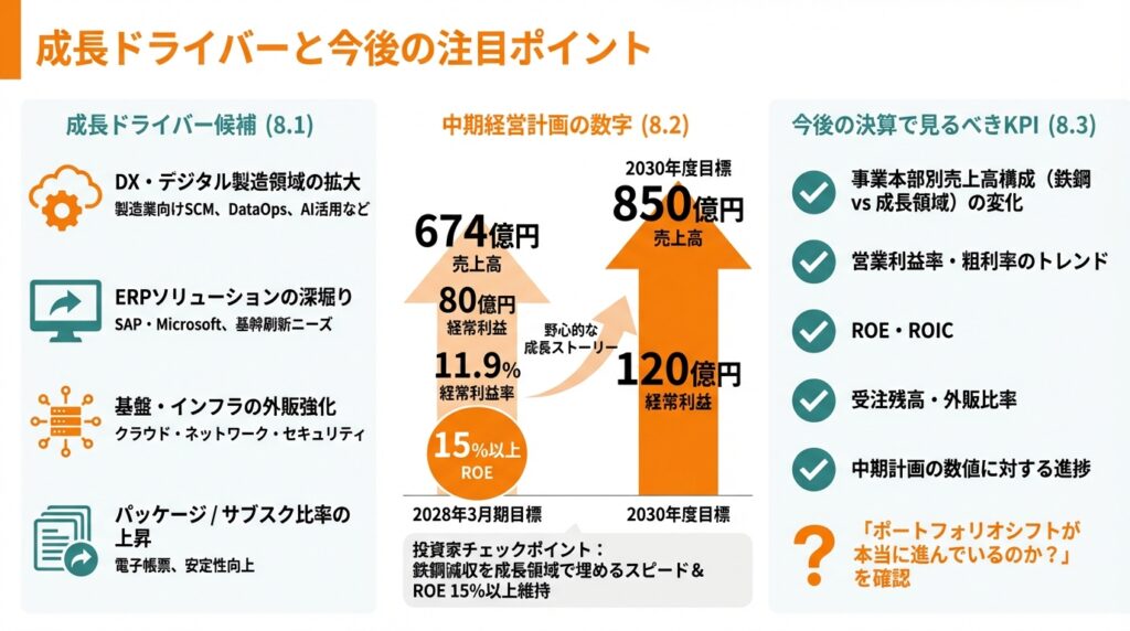 - 成長ストーリーの主役は、基盤・DX・ERP・パッケージなどの非鉄鋼領域へのポートフォリオシフト