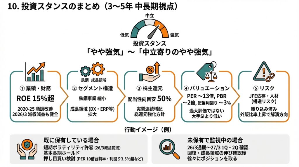 ここまでの定量・定性分析を踏まえ、中長期(3〜5年)投資家としてのスタンスを一言で表すと、
