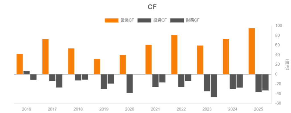 • 売上・営業利益は長期的に緩やかな成長トレンドで、営業利益率は8〜11%台、FCFも継続的にプラスと、収益・キャッシュフローともに安定感がある。