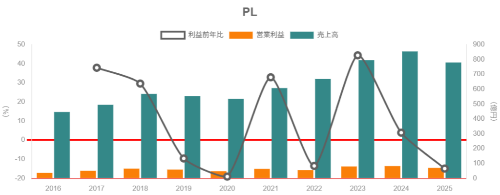 • 2024年が過去最高売上・営業利益だった反動もあり、2025年は▲8.7%減収・▲14.8%減益