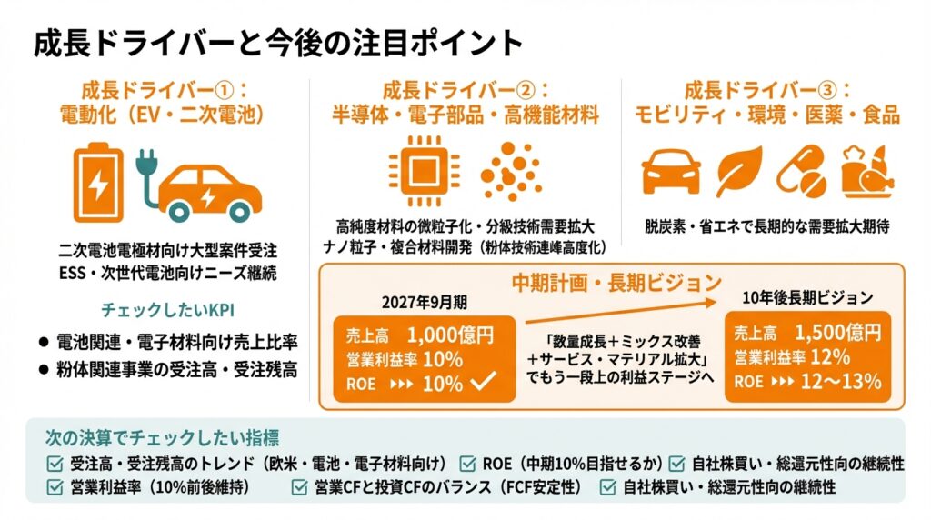 など、成長分野に広く関わります。設備投資サイクルは波がありますが、構造的には「高機能化・微粒子化ニーズの高まり」が追い風です。