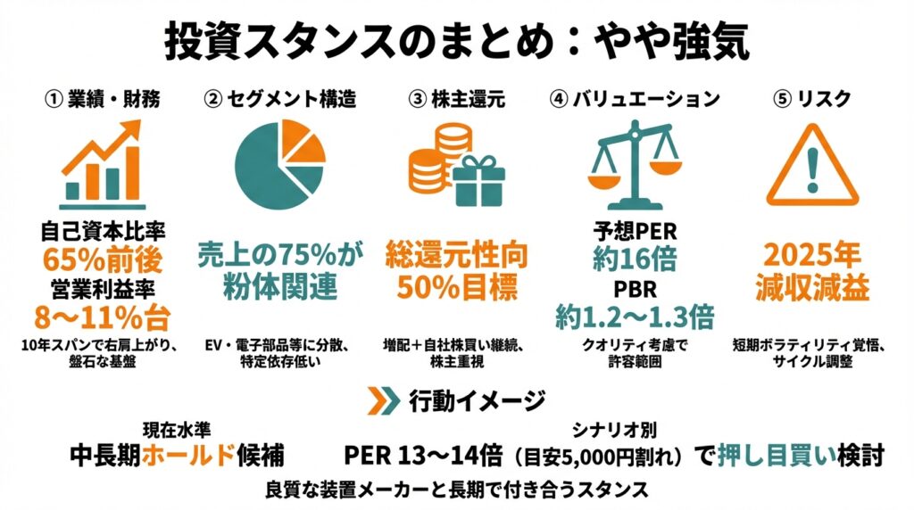 • 受注調整や円高などでPER 13〜14倍(目安株価5,000円割れ前後)まで押す局面があれば、“押し目買い候補”として検討する余地