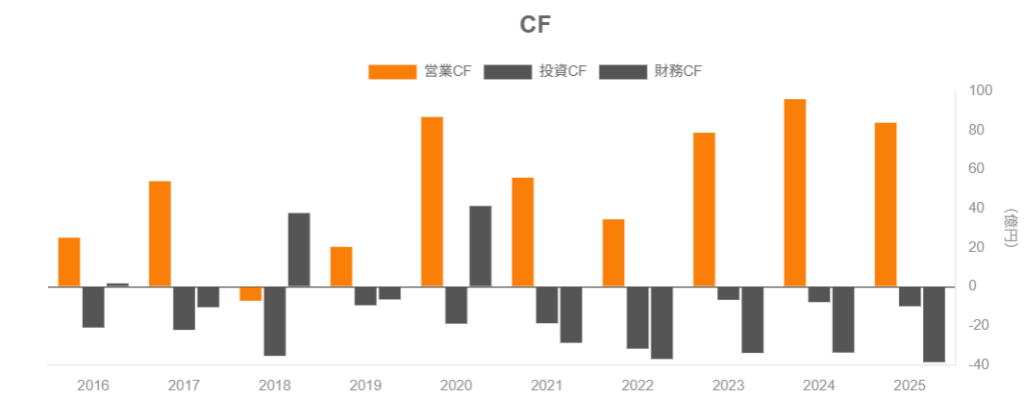 • ROE 10〜15%、自己資本比率70%超、ネットキャッシュ豊富。
