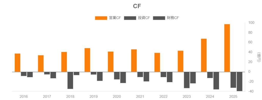 - 2021〜2025年で売上・営業利益とも年率2桁成長、営業利益率10〜12%、ROEはおおむね8〜12%、自己資本比率は60%台後半の堅固なバランスシート
