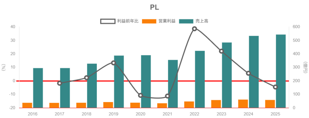 - 2021〜2025年で売上・営業利益ともに年率2桁成長