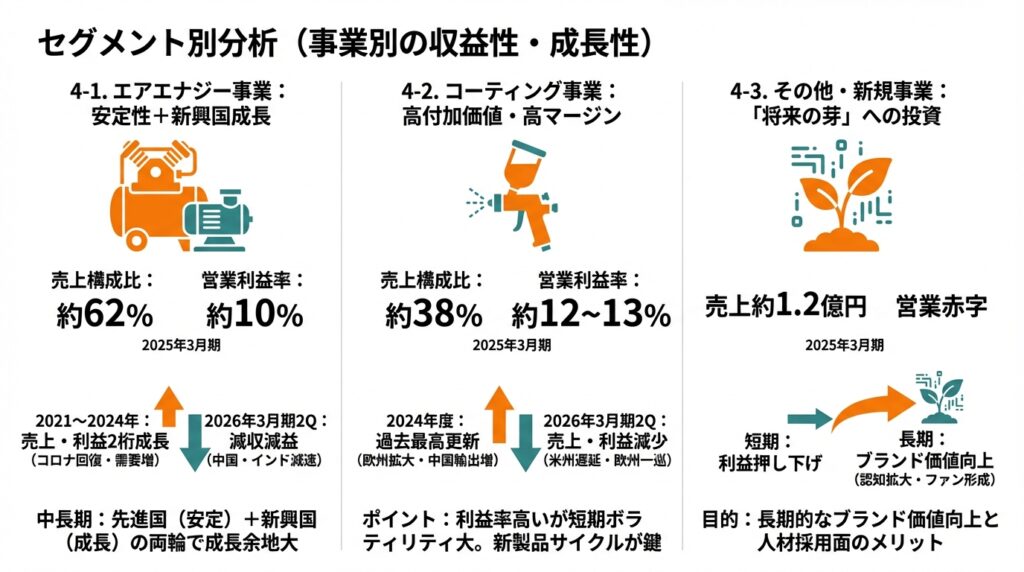 「インフラ性の高い安定収益源としてのエアエナジー」と、「高付加価値・高マージンのコーティング」という組み合わせが、同社の利益構造の大枠です。