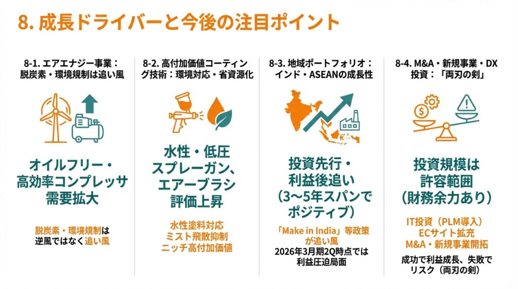 - インド・ASEAN・メキシコ等での新規工場投資 → コンプレッサ・塗装設備の新設需要
