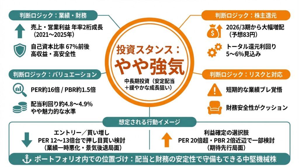- PER約16倍・PBR約1.5倍で、配当利回りはTOPIX・機械セクター平均を大きく上回る「やや割安〜妥当」レンジ