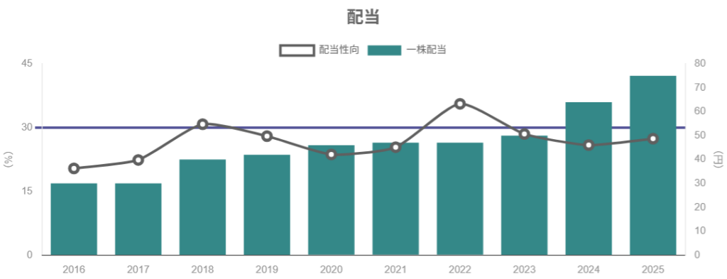 - 株主還元は累進配当+総還元性向40%目安へシフトし、2026年3月期は年間配当100円を計画。中長期投資家にとっての「安定配当+成長」の候補になりやすい。