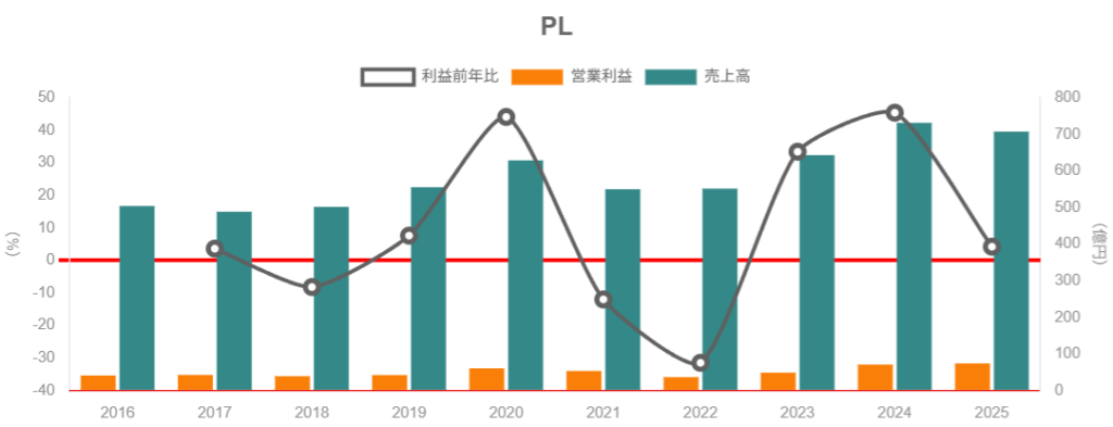 年次の売上高と営業利益(連結)は概ね以下の推移です(単位:億円)。