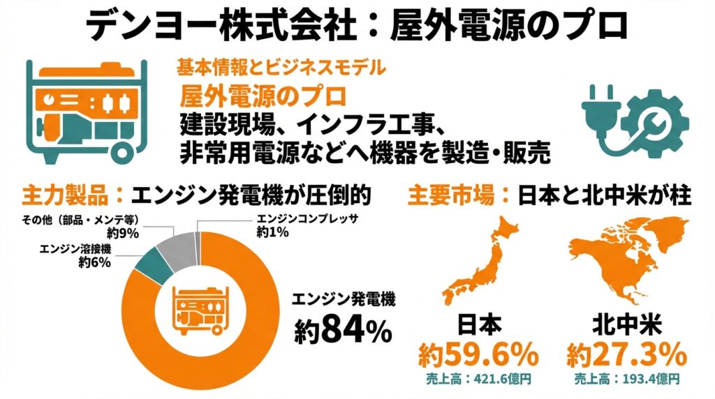 デンヨーは「建機そのもの」ではなく、「建機現場を支える電源・溶接・圧縮空気」を提供するニッチプレーヤーという立ち位置です。