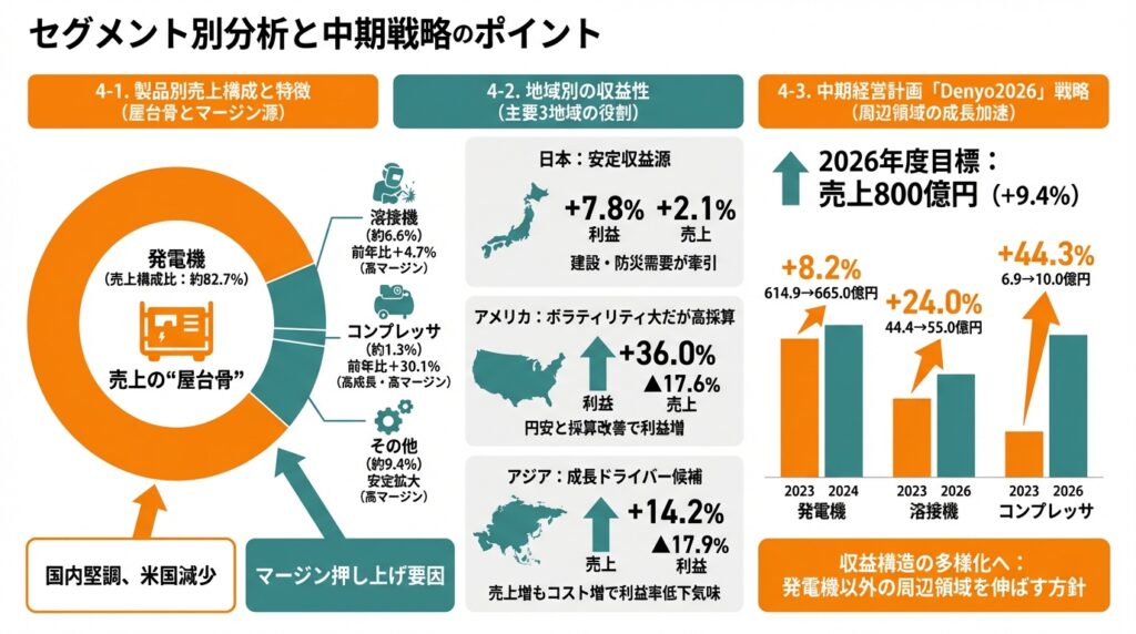 売上の8割超を発電機が占める一方、溶接機・コンプレッサ・部品・メンテナンスなどが利益の下支えや成長分野として位置付けられています。